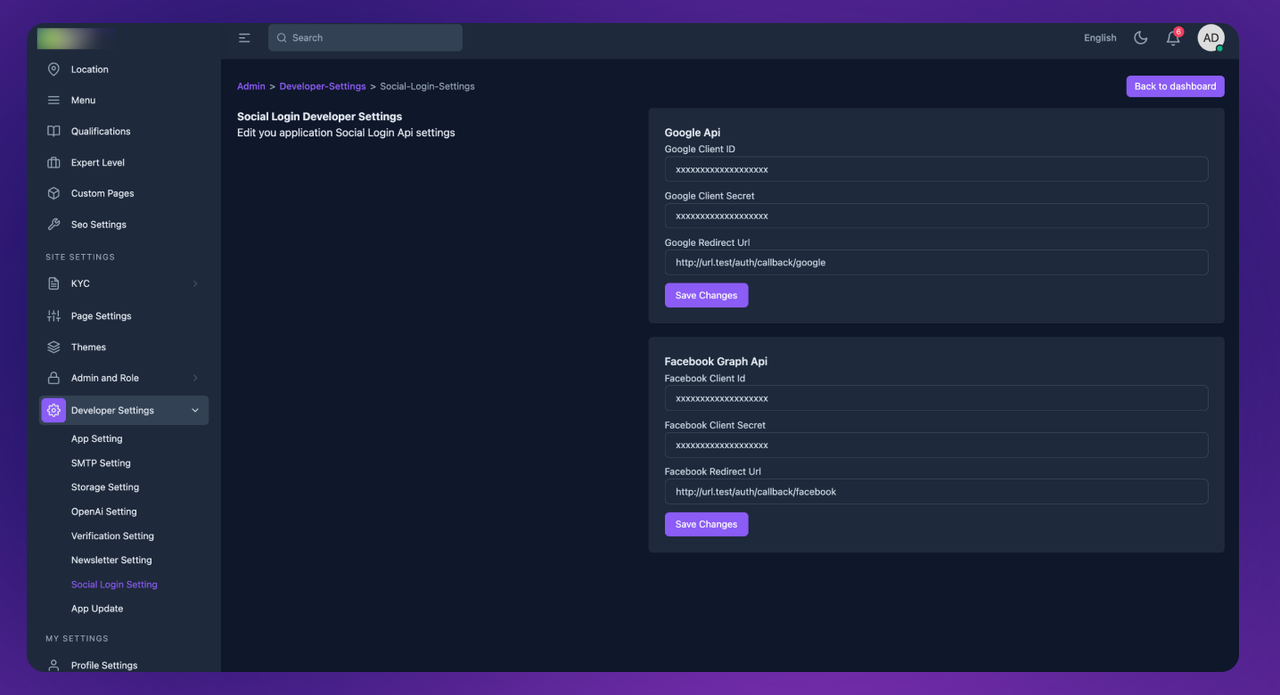 Or click to Developer Settings > Social Login Settings option from admin sidebar